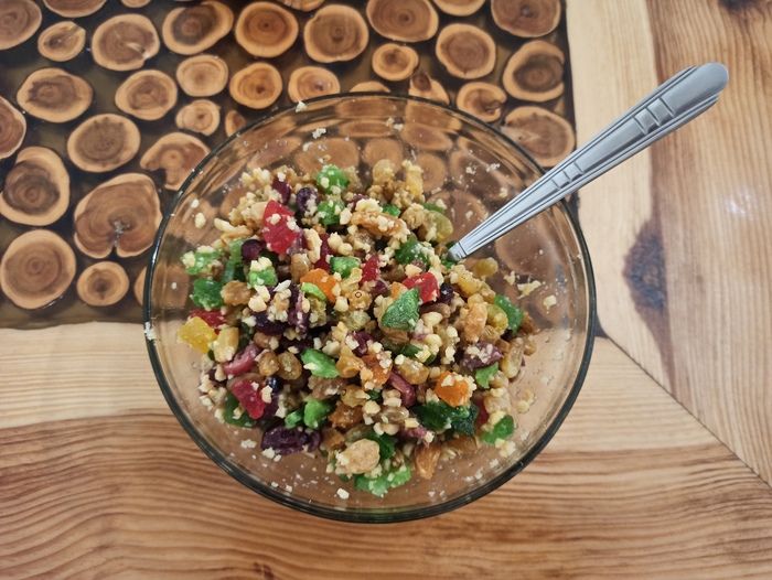 Напомню очень кратко. Пропорции 1:1:1:1, у меня все по 400 грамм: сахар (три вида, белый, обычный тростниковый, мусковадо), сливочное масло, мука (можно 70:30 обычную и ореховую или крахмал), яйца - 8 штук, сухофрукты разные и орехи - тут можно и больше. И их обязательно заранее (хотя бы за пару часов, если уже нет двух недель) замочить в крепком дистилляте. Бренди отлично подойдёт. Масло взбить с сахаром, добавить яйца по одному, потом наполнитель и муку с пряностями (корица, гвоздика, имбирь, мускат, кардамон - но коньяк их все равно победит.