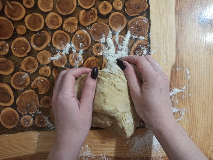 Когда тесто стало слишком густым для вилки, выложила его на стол и продолжила вымешивать, пока оно не перестало липнут к рукам и столу, но осталось мягким и эластичным.