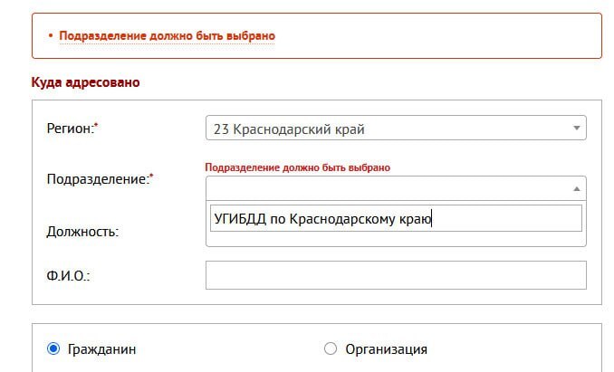 Много читал про обращения о нарушениях ПДД, решил в первые в жизни отправить обращение в ГИБДД, но при попытке выбора подразделения система зависает: