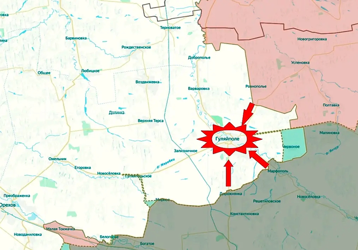Однако сегодня российские паблики сообщают, что наши дожидаться тактического окружения врага не стали и в ходе стремительных маневров с юго-востока и севера уже ворвались на окраины города, где занято несколько домов. Наступление ведется со стороны Ровнополья (северный фланг) и с востока от Марфополя. С юга ВС РФ прорываются через опорные пункты противника от Дорожнянки. От этих ранее освобожденных нашими бойцами населенных пунктов в Гуляйполе идут дороги, что, несомненно, позволяет ускорить наступление.