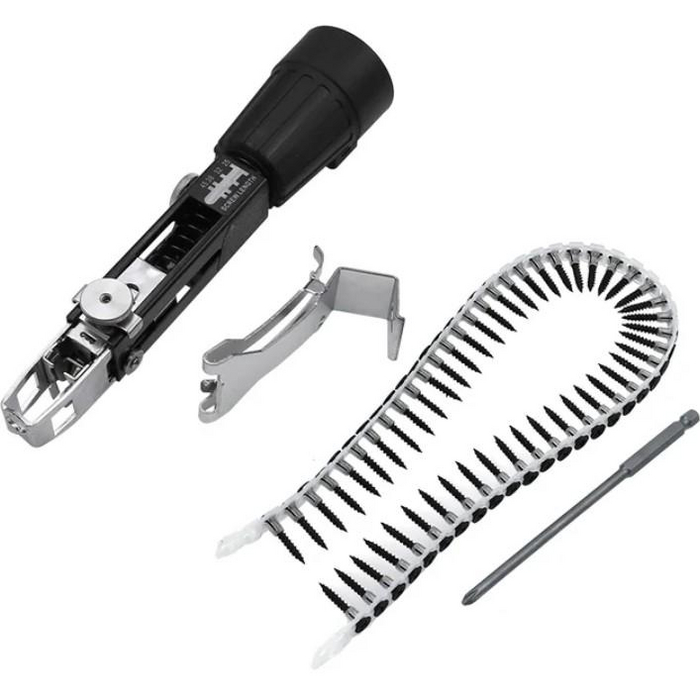 Если ваша работа связана с саморезами, то эта насадка облегчит вашу работу. Она одевается на шуруповерт или дрель и автоматически подает под установленную биту саморезы. Подача ленточного типа.