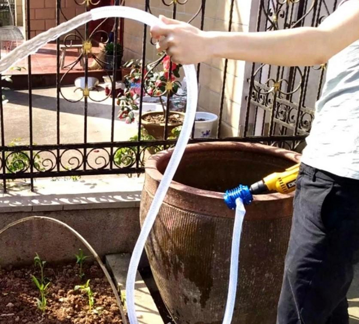 Если вы проживаете в частном доме или у вас есть дача, или вы просто расположились на кемпинге возле воды, но ведром черпать неудобно или вовсе невозможно из-за обрывистого берега, то можно воспользоваться водяным насосом, который работает от шуруповерта.
