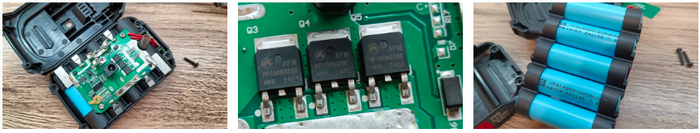 Предлагаю посмотреть на внутренности аккумуляторов. Ведь с помощью них работает шуруповёрт и длительность работы зависит от качественных источников питания. Шуруповёрт собран на четырёх саморезах. Внутри видим плату управления зарядом аккумуляторов, а также индикацию заряда аккумулятора. Пайка выполнена на должном уровне. Сборка выполнена на пяти аккумуляторах типоразмера 18650 ёмкостью по 2000 mAh каждый. Сборка выполнена на трёх высокотоковых мосфетах ар100n03bd по сто ампер каждый.