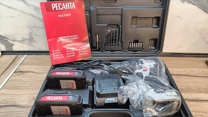 Предлагаю более детально рассмотреть шуруповерт от компании Ресанта. Модель ДА-20-2ЛК-БП построена на бесщеточном двигателе, что обеспечивает более высокую эффективность, мощность, надежность и длительное время работы от аккумулятора. В комплекте уже 2 аккумулятора по 2Ач, есть станция зарядки и удобный пластиковый кейс. В комплекте поставки присутствует стартовый набор оснастки, что позволит начать работу без дополнительных затрат. Наверное не стоит сравнивать данный шуруповерт со щеточным аналогом, но именно с него я перешел на Ресанту. Это просто небо и земля по мощности, весу и автономности. А еще есть расширенная гарантия до 5 лет.