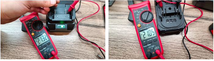 Станция зарядки выдаёт напряжение 21,3 в, а полностью заряжены аккумулятор 21.05в.