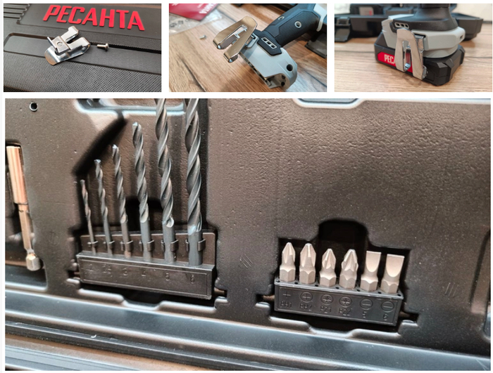 В боксе есть стартовый набор сверл и бит, а также удлинитель на магнитной основе. Это позволит начать работу не докупая расходный материал. У меня уже есть большой набор различных бит, которые я в дальнейшем буду использовать. А ещё есть специальная скоба для крепления на шуруповёрте. Данное устройство позволит подвесить шуруповёрт на монтажный пояс.