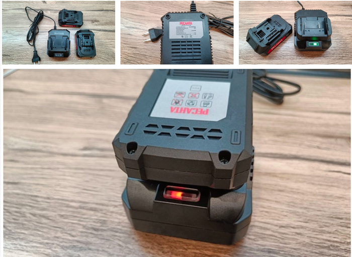 Заряд аккумуляторов производится с помощью специальной базы, хотя на корпусе аккумуляторов есть круглый разъём для подключения внешнего питания. Скорее всего, это универсальные аккумуляторы которые распространяются со всеми шуруповертами данного производителя и могут заряжаться двумя способами.