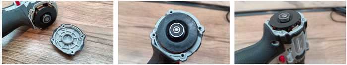 В шуруповёрт попасти не получилось, потому как на нижней части платформы есть заводская гарантийная пломба. Можно лишь добраться до подшипника бесщеточного двигателя с тыльной стороны устройства. Можно увидеть массивный вентилятор охлаждения и тыльный подшипник 625rs.