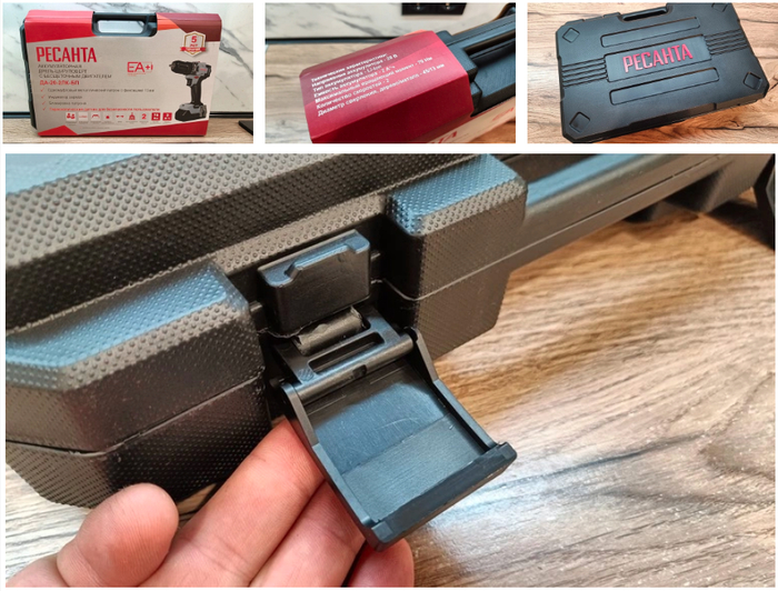 У аккумуляторного шуруповерта Ресанта ДА-20-2ЛК-БП появился качественный пластиковый кейс и тут дело даже не в пластике. А именно в его исполнении. Инструмент хорошо удерживается внутри, есть необходимые слоты под оснастку и метизы. Защелки надежные и прекрасно фиксируют крышки. Поверх пластикового бокса была картонная рубашка, которая дополнительно защищает инструмент во время транспортировки. На коробке можно увидеть часть технических характеристик и ключевые особенности инструмента.