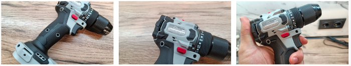 С тыльной стороны можно увидеть большую обрезиненную накладку с указанием использования бесщёточного двигателя. На верхней части есть переключатель скоростей.