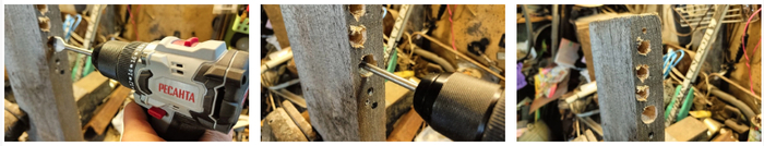 Напомню, что производителем заявлено сверление древесины до 30 мм. Такого сверла у меня не оказалось, но есть перо на 22. Устанавливаем его и делаем несколько отверстий. Получаются ровные круглые отверстия, так как инструмент не бьёт и соосность не нарушена.