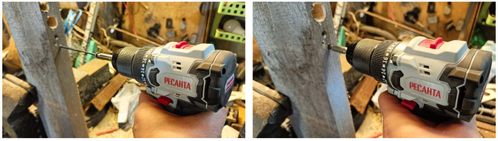 Начнём пожалуй с самого простого. Для этого будем использовать сверло на 13, и толстую доску. Не забываем выставить режим сверления и вторую скорость. Для более точного входа в дерево можно слегка нажать на курок шуруповёрта, чтобы использовать плавный пуск на низких оборотах. А когда сверло погрузится в древесину можно сверлить на более высоких оборотах и время от времени очищать сверло от стружки.