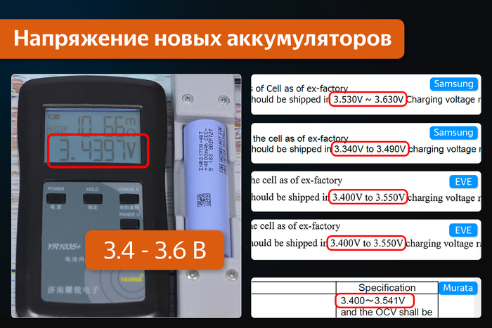 Напряжение новых li-ion аккумуляторов всех производителей, которые достали из заводской коробки, всегда находится в диапазоне от 3,4 до 3,6 Вольт. Многие производители даже указывают этот диапазон в своей технической документации (справа на фото).