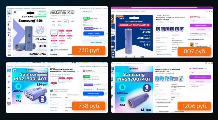 На маркетплейсах цены на li-ion аккумуляторы чаще всего не самые гуманные. Например, Samsung INR21700-40T, стоит от 700 рублей. Это и понятно, любой маркетплейс имеет свою комиссию, которая закладывается в цену товара. В магазинах, специализирующихся именно на продаже li-ion аккумуляторов, этот же аккумулятор вполне можно купить по цене в районе 500 рублей. А при покупке большого количества и того ниже.