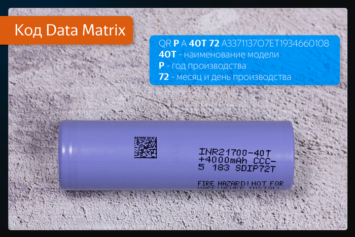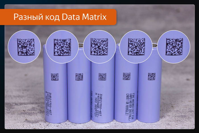На большинстве моделей Samsung формата 21700 есть квадратный код. Это код DATA MATRIX. Не путайте его с QR-кодом. Это разные форматы квадратного штрих кода. Код DATA MATRIX индивидуален для у каждого аккумулятора.