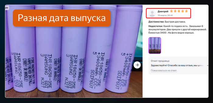 Но и наши маркетплейсы не исключение. На фото ниже два правых аккумулятора выпуска июнь 2024 года, а остальные - июль 2023 года. Сам отзыв от 15 марта 2025 года.
