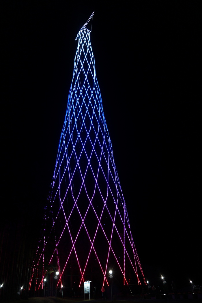 На Шуховской башне под Дзержинском летом сделали светодиодную подсветку. Подсветка динамическая и открыта для всех желающих. Дорогу тоже сделали, поэтому можно проехать на любой машине.
