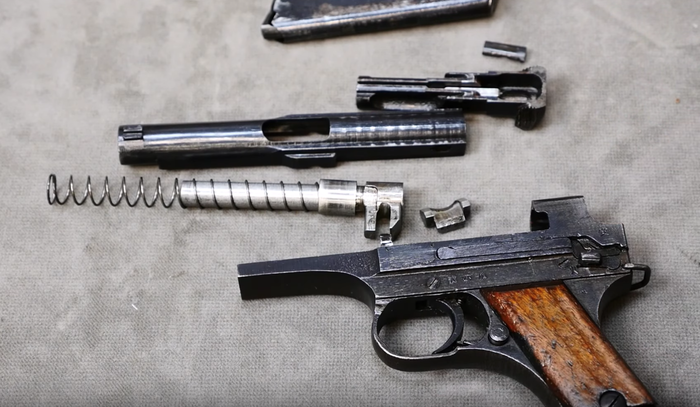 Разборка пистолета была достаточно затруднена - для снятия фиксатора затвора надо было отвести затвор в крайнее заднее положение, зафиксировав его руками в этом положении, засунуть палец внутрь затворной рамы и отжать ударник, а потом из того же положения - выдавить другим пальцем фиксатор затвора. Если в процессе разборки не отжать ударник, то разборка могла привести к повреждению и фиксатора и ударника.