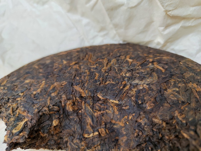 Блин спрессован равномерно и не слишком плотно, лист крупный, собран со взрослых чайных кустов, в купаже много почек. Аромат сухой и в нем уже проявляются выдержанные ноты. После прогрева чай отдает тонкий аромат женьшеня, грибов и влажной древесины. Первый пролив наполнен коричнево- оранжевым светом, на вкус он тонкий и легкий, орехово- древесный, с легким оттенком сливы. После двух-трех пиал проясняется ум и чувства усиливаются. С третьего пролива чай начинает полностью отдавать свой цвет и вкус. Ореховые ноты усиливаются, особенно чувствуется приятные горечь и кислинка грецкого ореха. Никуда не уходит древесный фон с оттенками пряностей, он делает напиток слегка терпким. На заднем плане раскрывается послевкусие сливы и лонгана. Местами возникают ассоциации с китайскими древесными грибами Муэр, из за их приятного сочетания сладкого, кислого и дымного вкусов. С 4ого пролива и почти до самого завершения чаепития в этом пуэре ощущается невероятный аромат свежести, присущий Шенам или очень дорогим Шу. К этому моменту вы уже будете наполнены созидательной энергией и сосредоточены. Завершающие проливы плавно объединяют все тона и полу-тона в один сбалансированный вкус, о том что чаепитие подходит к концу, нам сообщают хлебные, банные и скирдяные ароматы.