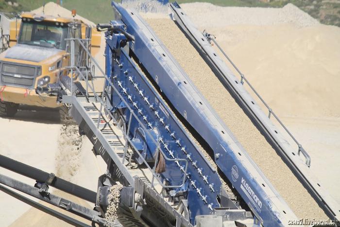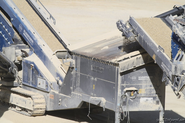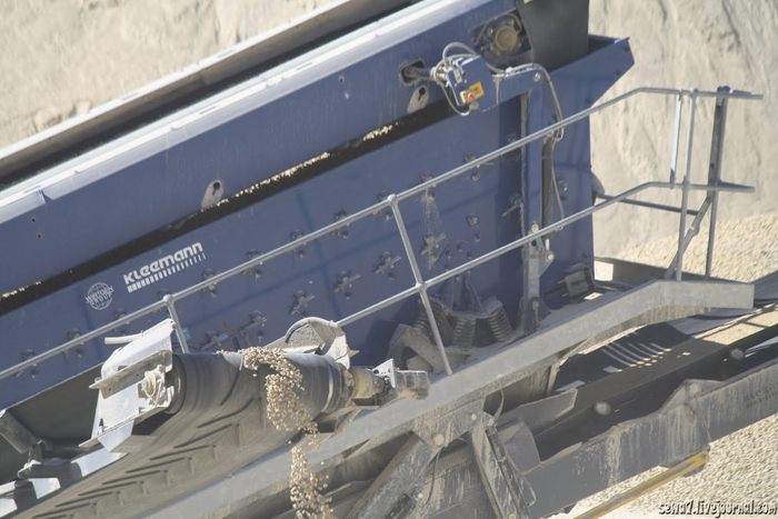 Первоначально раздробленная порода попадает на первый конвейер первичной машины,