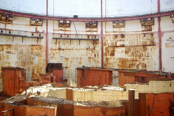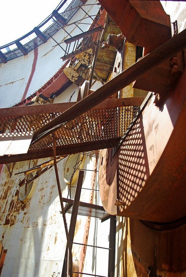 Кстати, о том, где эта улиточка лежит. Самое светлое (кроме крыши) место АЭС, ибо потолка в нем не имеется. Это, господа, центральный ствол реактора. Примечателен был многим - в частности, опоясывающими его в два слоя стальными стенами по 2 метра толщиной каждая. В простенок в случае аварии предполагалось заливать воду. Выглядит все это эпично до состояния не могу - в таких декорациях надо играть что-то вроде DayZ или Fallout'a.