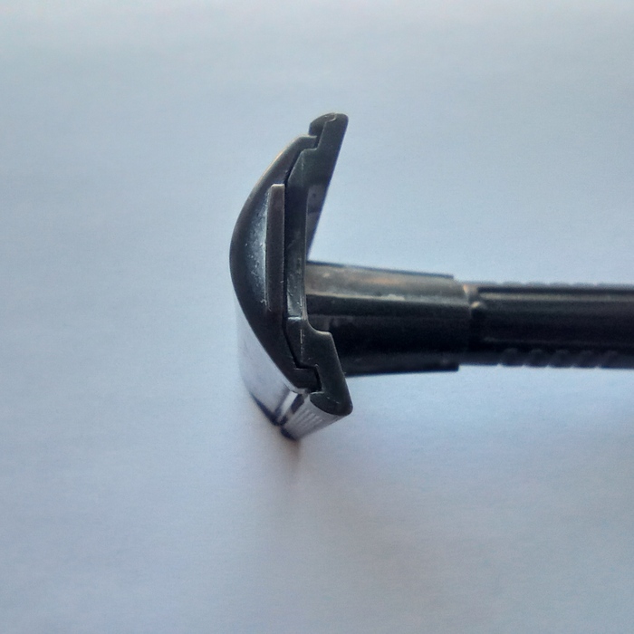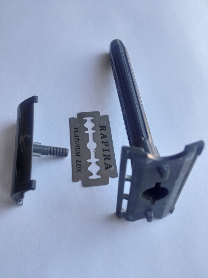 Для сравнения ниже покажу 2 бритвы с малым (бритва dorco из Ашана) и большим (рапира) радиусом рабочей (бреющей) части бритвы.