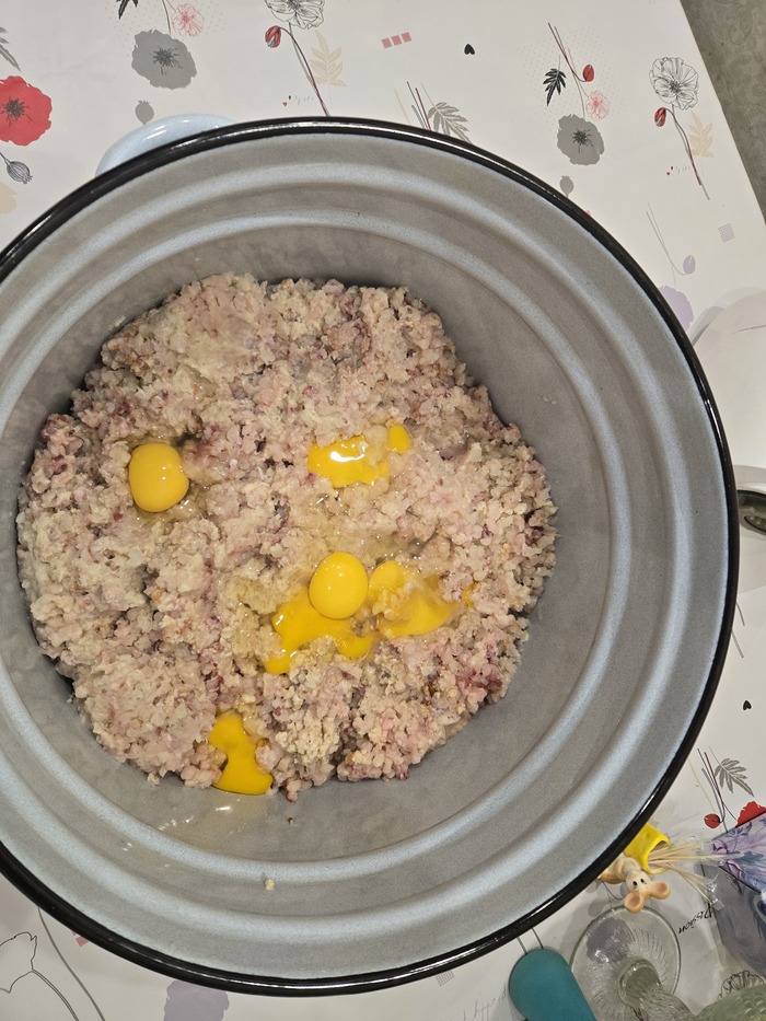 Дальше мясорубка. В помол 6 яиц, соль и черный перец "на глаз".
