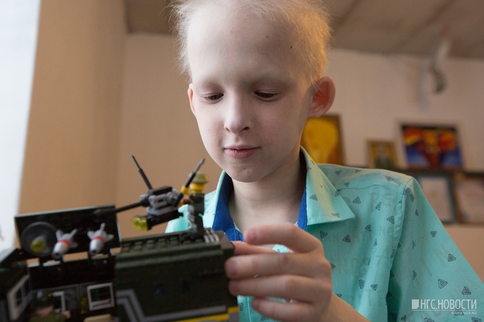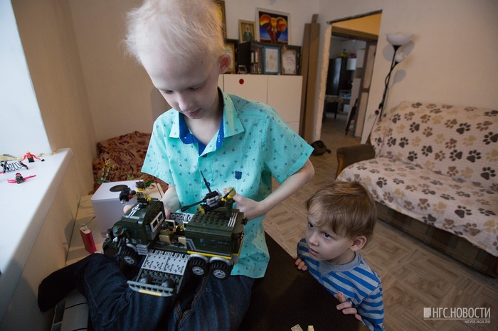 Миша напоминает хрупкого эльфа — фарфорово-прозрачная кожа, пушистые белые волосы и светлые глаза. Но, несмотря на худобу и внешнюю слабость, он встречает корреспондентов, эффектно «выкатываясь» в прихожую колесом.
