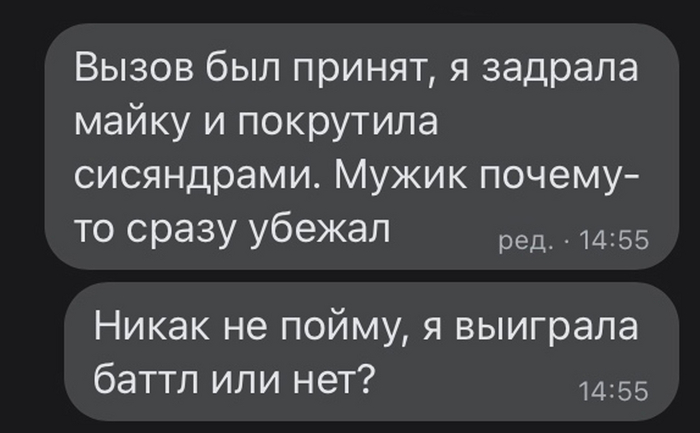 Тут я охуела и, потеряв связь с реальностью, как заору. С испуга, не иначе, выдаю: