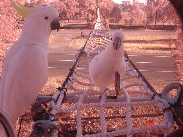 8. Какаду занимают веревочный мост, предназначенный для белок в Виктории, Австралия.