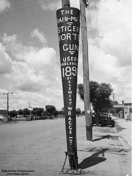 Одна из самых известных авантюр с этой пушкой случилась в 1901 году, в западном Квинсленде (Австралия). Правда, цель была иная - не град разогнать, а дождь вызвать. Местность изнывала от засухи. Метеоролог Клемент Линдли Врагге, человек, судя по всему, решительный, заказал на заводе в Брисбене шесть таких орудий и отправил их в городок Чарлевиль.