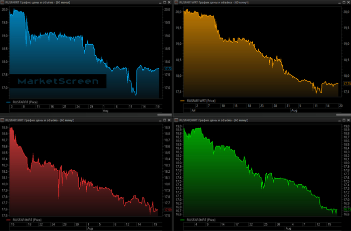В середине августа короткие ставки немного сошли с ума, но всё вернулось. Сейчас овернайты и недельки примерно одинаковые, чуть ниже ключевой. Месячные ставки чуть ниже. Оно и понятно, ибо до решение по ключевой осталось меньше месяца. А вот трёхмесячный RUSFAR упал в районе 16,73. Напомню, что прямо перед прошлым объявлением ставки 25 июля этот индекс находился на 17,55. И ставку уронили на 18%. Текущее его значение говорит о том, что участники сего рынка видят сентябрьское снижение ключевой до 17%.