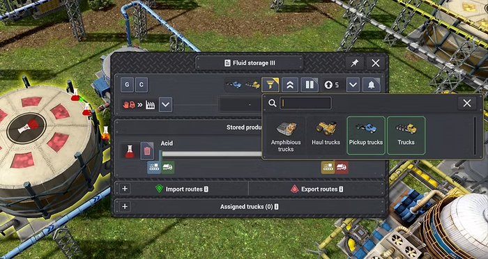 Чтобы интегрировать транспортные средства-амфибии в игру, мы расширили и улучшили систему логистики. По умолчанию грузовики-амфибии будут выполнять только назначенные задания или задачи, недоступные обычным грузовикам. Мы также добавили фильтры транспортных средств для складских помещений и логистических зон для точного контроля. В качестве бонуса теперь вы можете указать, что определенные хранилища должны или не должны обслуживаться определенными типами транспортных средств, такими как самосвалы.