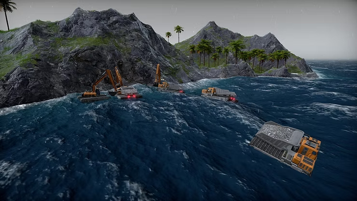 И тут нас осенило: что, если бы грузовики и экскаваторы могли просто передвигаться по воде? Дамы и господа, позвольте мне представить вам еще одну функцию обновления 4: транспортные средства-амфибии!