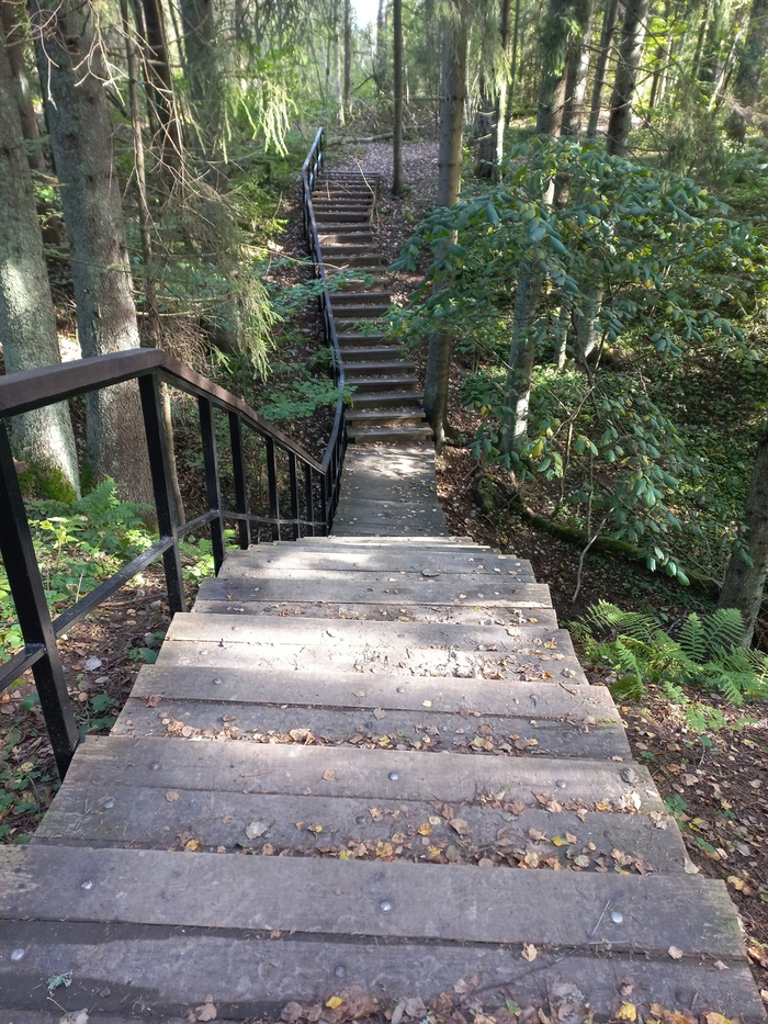 Экомаршрут не доходит до места, где была лечебница, а мы когда-то доходили. На месте корпусов впоследствии был выстроен рыбопитомник, а каменная лестница в 140 ступеней, которая некогда поражала воображение посетителей, привыкших к плоским пейзажам столицы Российской империи, была заменена металлической.