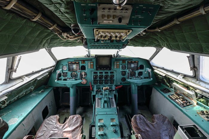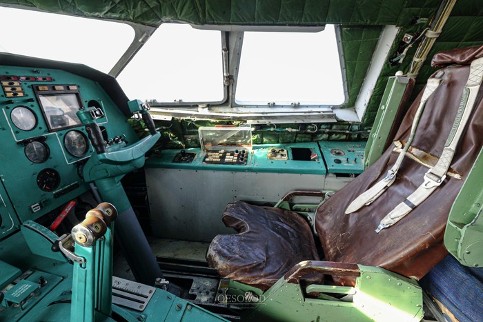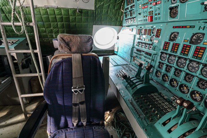 Пора заглянуть внутрь, и увидеть экраноплан Лунь не только снаружи. Скажу сразу, описание начинки оказалось слишком сложным для меня. Тем более не удалось полностью осмотреть все отсеки и закутки. Кроме этого внутри очень темно, даже днем при ярком солнце, что сильно осложнило фотографирование. Начинаем мы с кабины пилотов. Всего экипаж составлял 10 человек, автономность 5 суток. Управлял им пилот самолета, помогал в этом второй пилот. Во время движения они не могли отлучиться со своего места. Следующий факт остался без подтверждения. Но по заявлению одного человека кресла пилотов имеют специальную форму, с выемкой между ног. Это было нужно, чтоб члены экипажа могли не отлучатся со своего места даже в случаи нужды. Снаружи корабль, внутри самолет. Находясь в кабине ощущаешь это сильнее всего. Во время движения приходилось следить за множеством показателей, высота над уровнем поверхности, угол наклона, скорость и т.д. И я если честно не представляю, как пилоты умудрялись контролировать, что происходит снаружи, через такие маленькие окна. Позади двух пилотов есть еще одно место, у которого элементов управления не меньше. Тут и система управления пожаротушением, и гидравликой, контроль уровня топлива, температуры и еще много всего. Возможно я ошибаюсь (поправьте если так), но кажется это место борт механика.