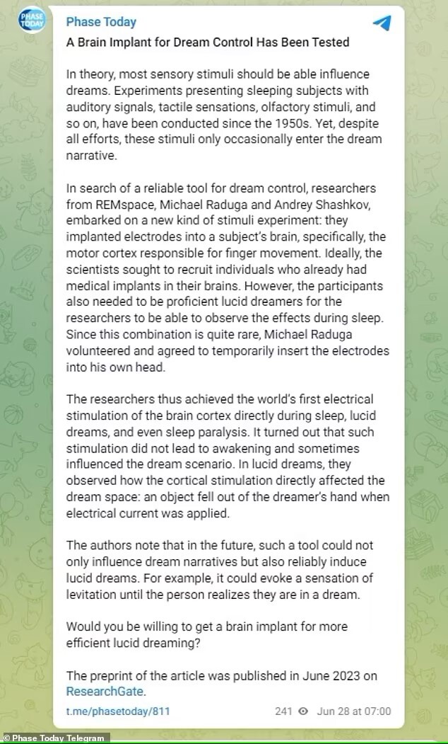22 ИЮЛЯ 2023г. 40-летний российский исследователь Михаил Радуга самостоятельно вживил себе в мозг имплант, чтобы "контролировать свои сны". Россиянин сделал себе операцию на головном мозге в своей гостиной в Казахстане