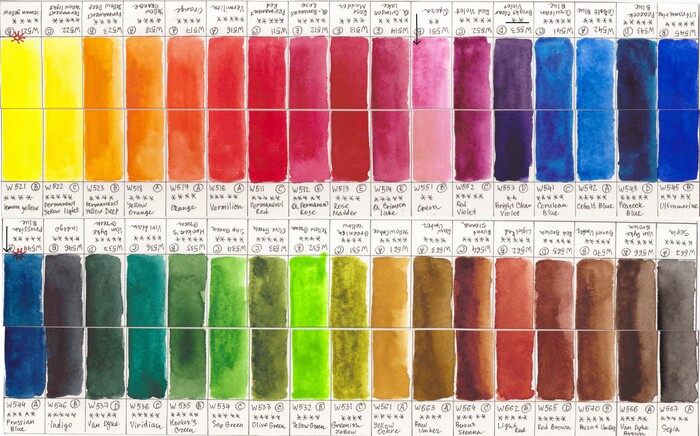 Сильно изменился хинакридон фиолетовый (я бы поставила 1 звезду), хинакридон пурпурный немного посветлел (2 звезды оправданно), опера ушла в ноль, изменился в тоне и посерел перилен бордовый, ультрамарин фиолетовый заслуживает только 1 звезду вместо трех, диоксазин фиолетовый подтверждает свои 2 звезды, голубая ФЦ тянет только на 2 вместо 3, как и берлинская лазурь и зеленая ФЦ.