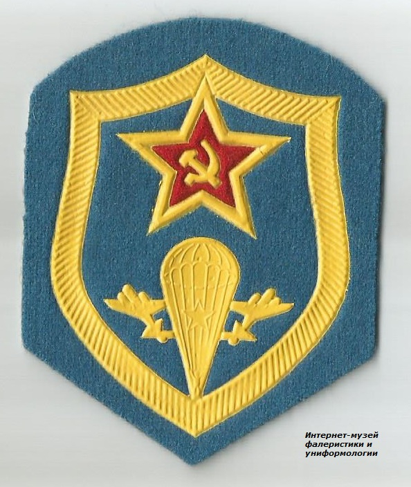 Нарукавный знак военнослужащих Воздушно-десантных войск образца 1969 года. Представляет собой щит золотистого цвета с эмблемой Воздушно-десантных войск (раскрытый парашют на фоне двух самолетов) и красной пятиконечной звездой с серпом и молотом с золотистой окантовкой на голубом поле. Размер щита 7,2 х 5,5 см. Размещался: на левом рукаве парадно-выходных мундиров военнослужащих сверхсрочной службы, сержантов и солдат срочной службы, курсантов Рязанского высшего воздушно-десантного командного Краснознамённого училища, а с 1972 года также прапорщиков; на левом рукаве шинели сержантов и солдат срочной службы, курсантов Рязанского высшего воздушно-десантного командного Краснознамённого училища.
