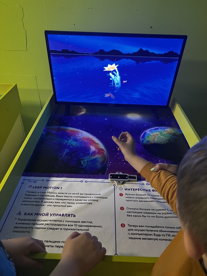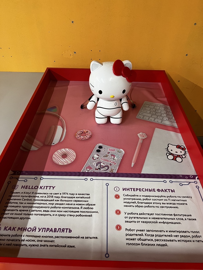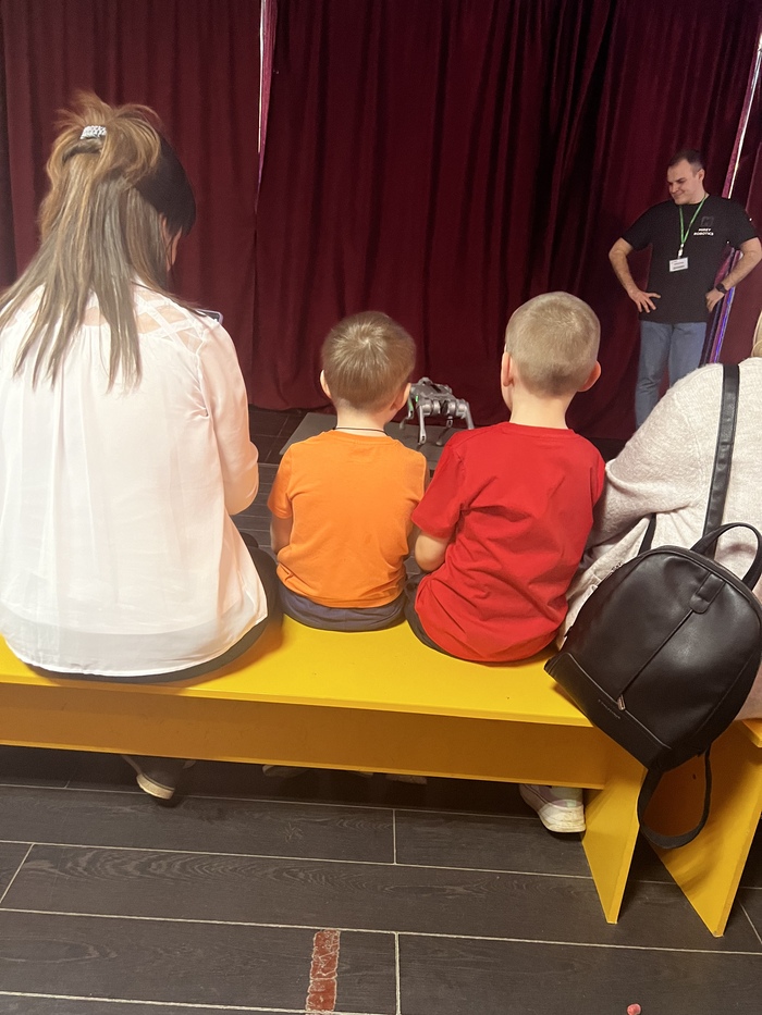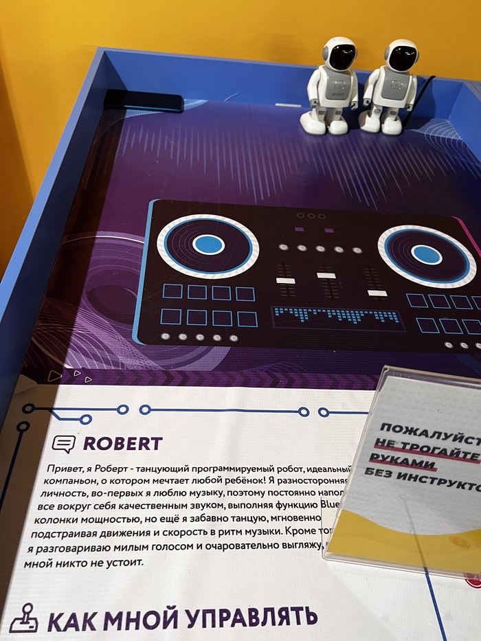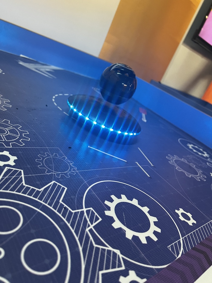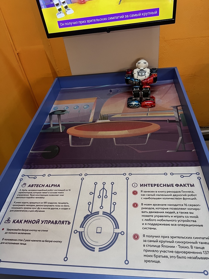 Идем к другому столу, там робот на магнитной подушке завалился на бок и не левитирует. Ребята пытаются его поставить на место, на них ругается экскурсовод из группы людей за соседним стендом (стенды вплотную), мол, без сотрудника трогать нельзя. Я говорю «Вы могли бы, пожалуйста, его поднять?», мужчина говорит «Тут вообще индивидуальная отдельная экскурсия за отдельную плату, идите вон поищите кого-то». Ясна-понятна) Ребята успели поднять.