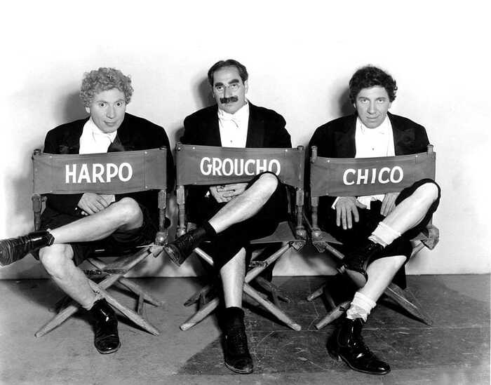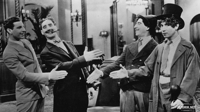 В семье еврейских эмигрантов, в Нью-Йорке в конце 19....начале 20го века родились один за другим пятеро братьев. И надо такому случиться, что невероятный природный талант и непревзойдённая музыкальность привели их на вершину славы. Начиная с 20-х годов и по конец 50-х - это однозначные фавориты жанра американской комедии и сумасшедшей эксцентрики. Начинали они как музыкальная группа, но постепенно отошли от этого и каждый стал развивать собственное амплуа. Братья выбрали себе сценические псевдонимы Чико, Граучо, Харпо, Гаммо и Зеппо. Впоследствии двое (Гаммо и Зеппо) отошли от сцены и занялись продюсерством и бизнесом, но оставшаяся троица неугомонных эксцентриков продолжила триумфальное шествие по сценам и экранам мира.