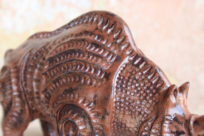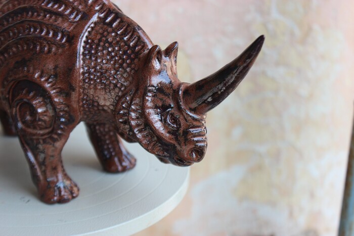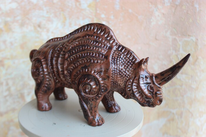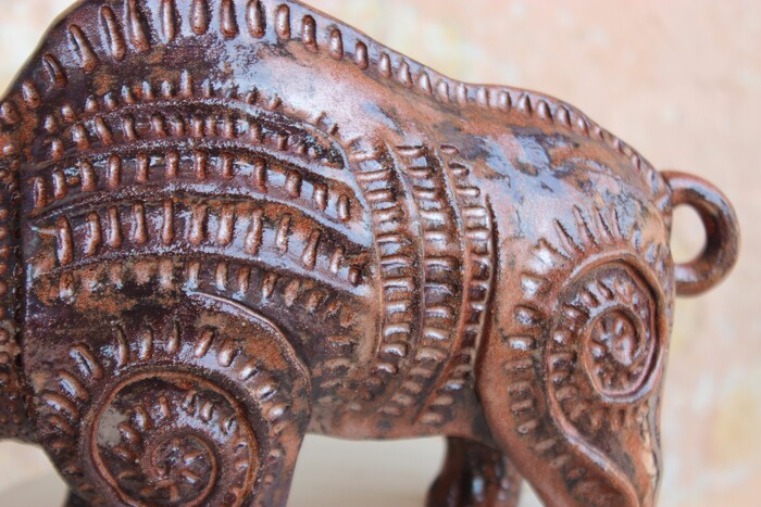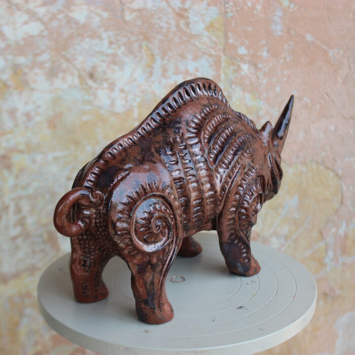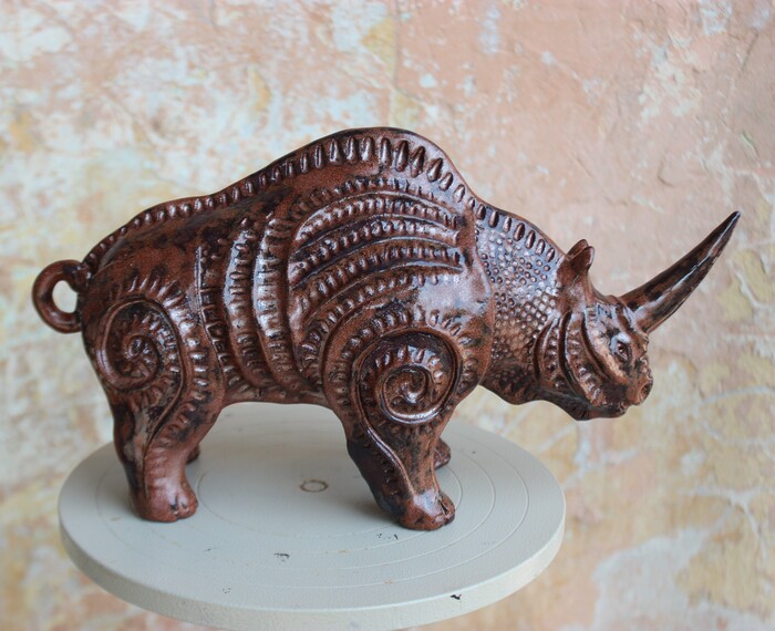Лепил вручную, без форм и каркаса из самодельной керамической массы на основе дикой глины. Содержание шамота около 40%. Обжиги 1000/1050 градусов. Декорирована работа глазурью "Медно-золотая".