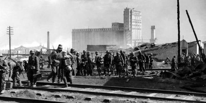 Солдаты 94-й пехотной дивизии вермахта на фоне элеватора.