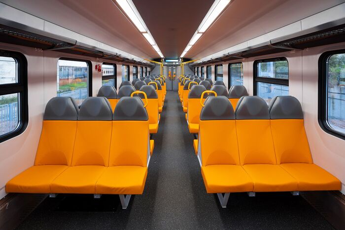 Внутри поезд оформлен в серо-оранжевой цветовой гамме. Дизайнеры и проектировщики изучили мировые тенденции и поменяли форму кресел в вагонах. В них можно сесть глубже, а дополнительная выемка в спинке позволит менять положение тела во время поездки.