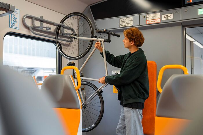 В головных вагонах поезда предусмотрели велопарковки - на стенах есть крепления, которые держат велосипед вертикально. Так он занимает меньше места.