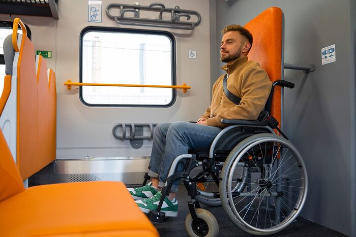 Для пассажиров на инвалидных колясках в головных вагонах установили откидные аппарели для проезда в салон на коляске. Внутри вагона есть места для крепления колясок. Там же находятся туалетные комнаты с откидными поручнями и кнопкой экстренной связи с машинистом.