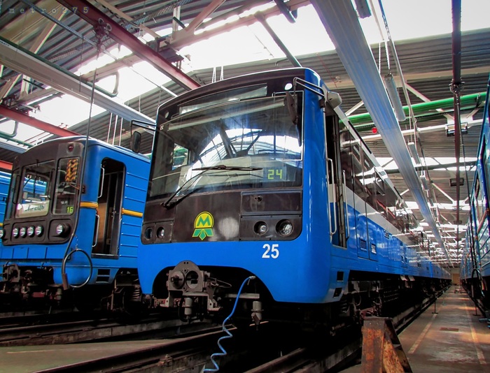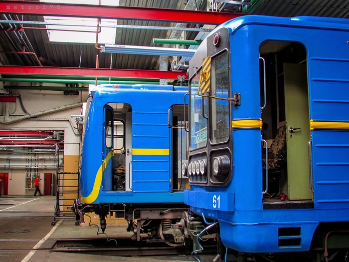 Цифровое обозначение - 81-7036\81-7037. 81-7036 - голова, а 81-7037 - это промежуточные вагоны. Данный тип подвижного состава производился на Крюковском вагоностроительном заводе, в Украине.