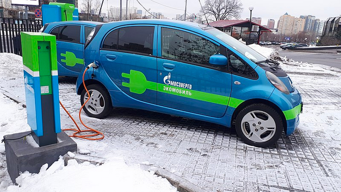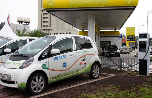 Домашняя заправка Mitsubishi i-MiEV — единственного электромобиля, продаваемого в России в начале 2010. На втором фото тот же Mitsubishi i-MiEV в опытной эксплуатации Газпрома у зарядной станции