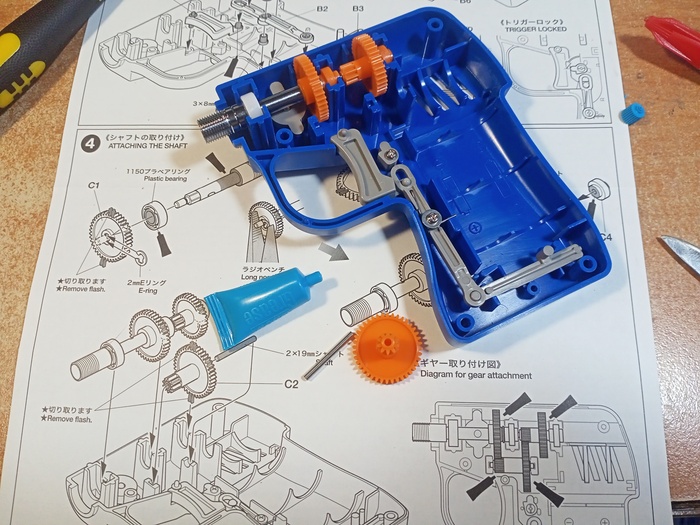 3. Добавляем предохранитель курка и блокиратор патрона. Собираем оси и шестерни передач. Тут не стоит жалеть смазки, её в тюбике хватит на пару таких дрелей.