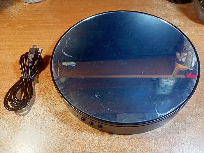 А так собственно выглядит подставка и шнур. Диаметр зеркала - 20 см, высота подставки - 3.5 см, вес (поверил производителю, сам не взвешивал) - полкило. А вращать эта малышка может груз до 5 кг (опять же согласно производителю). Мне мощность двигателя не особо важна, модели и даже диорамы редко бывают тяжёлыми.